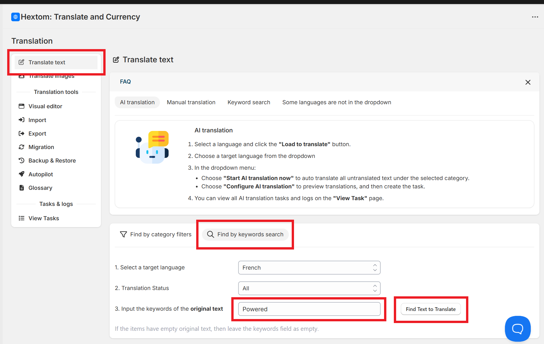 - Go to Hextom: Translate & Currency app and select "Manual Translation" either from the app dashboard or in the sidebar navigation, then use the keyword search to find the text "powered", as shown below,