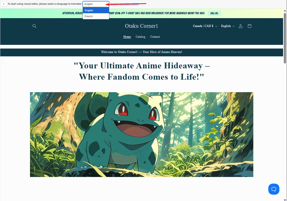 - Navigate to the Visual Editor page in the sidebar and select the language you want to translate.