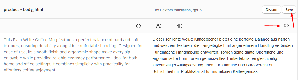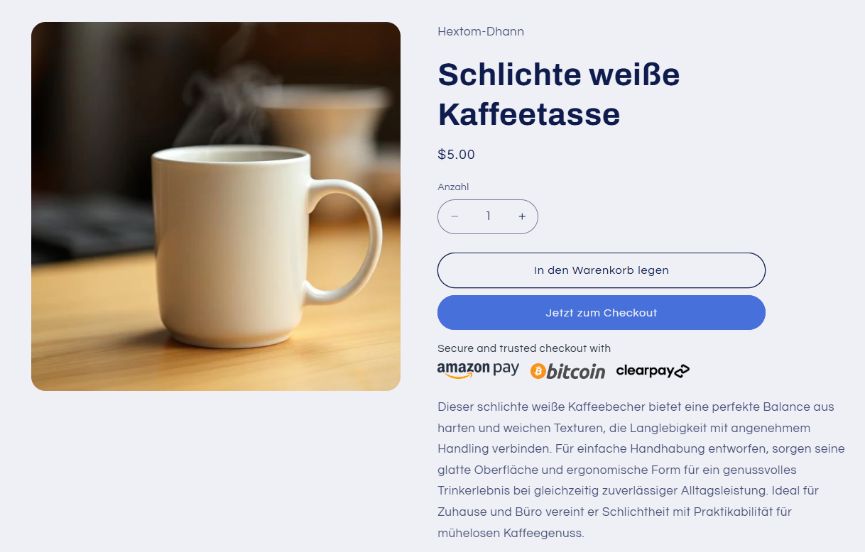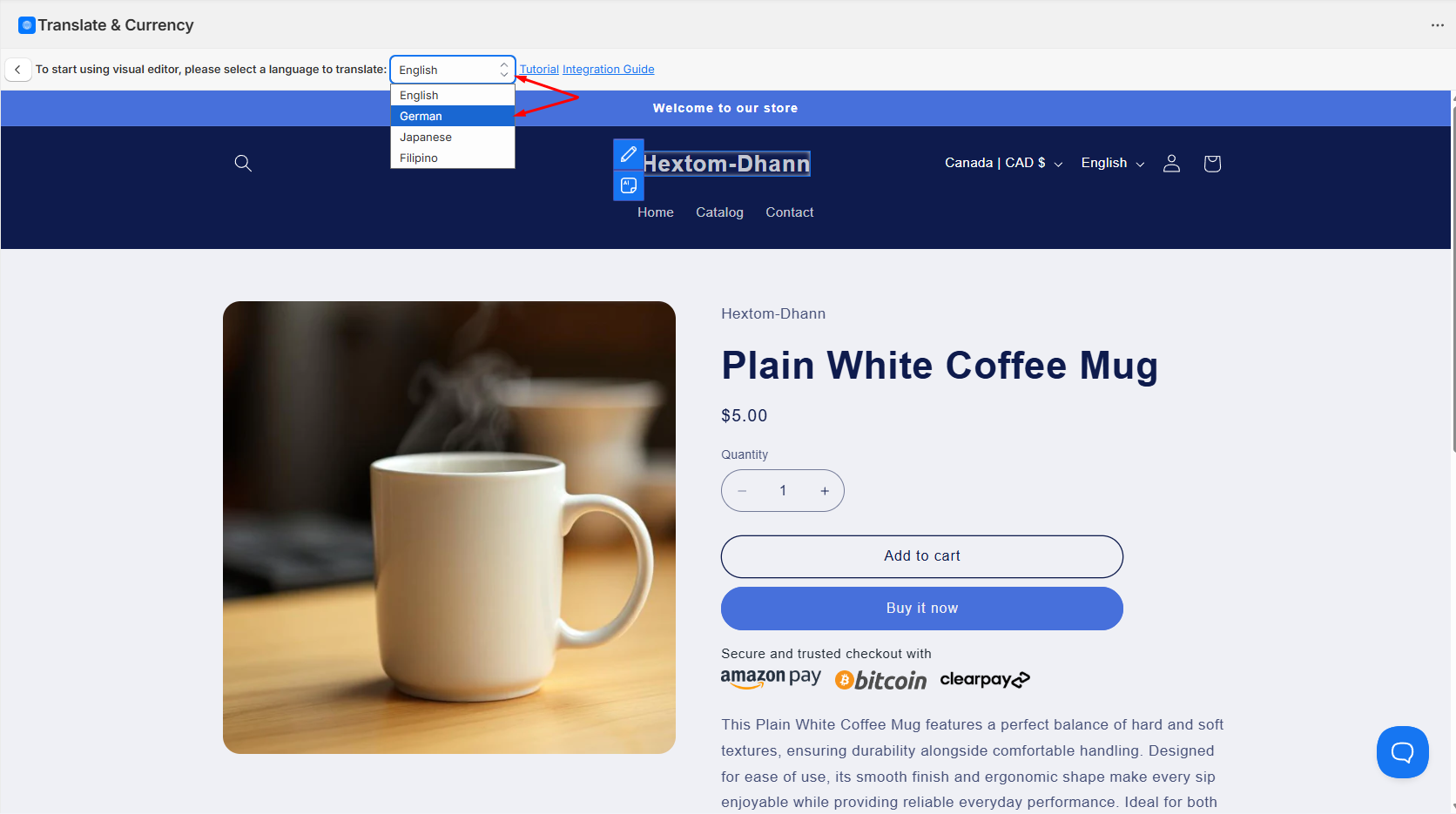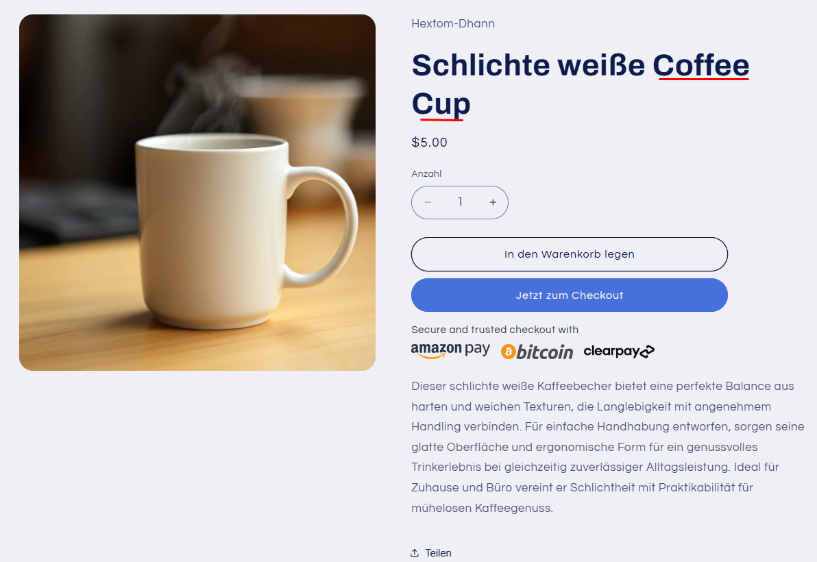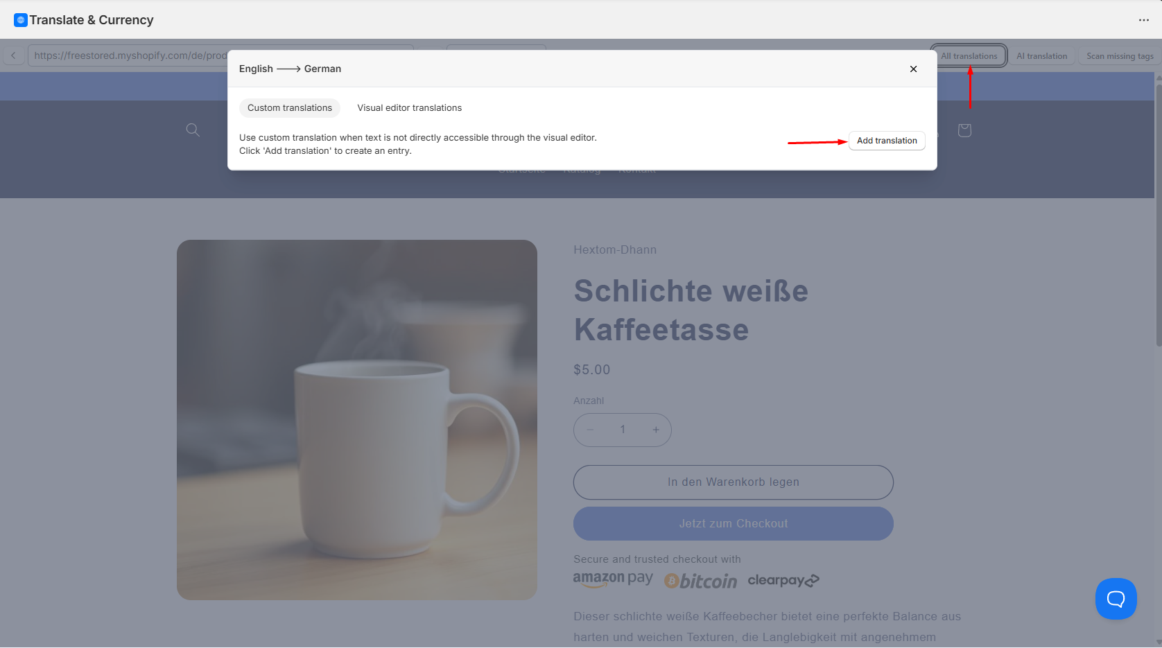 However, shortly after the store finishes loading, this is replaced by the translation in the image below. The replaced words are the following: Kaffeetasse to Coffee Cup