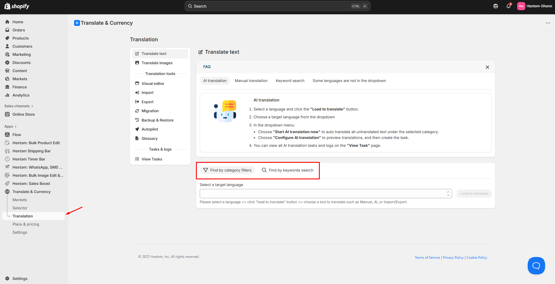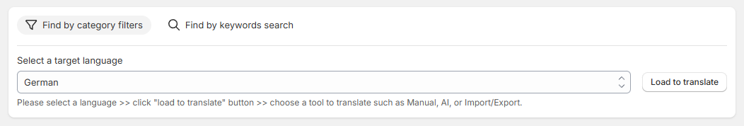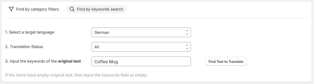 - For Manual translation, you can use either the "keyword search" or "category filters", to find the text.