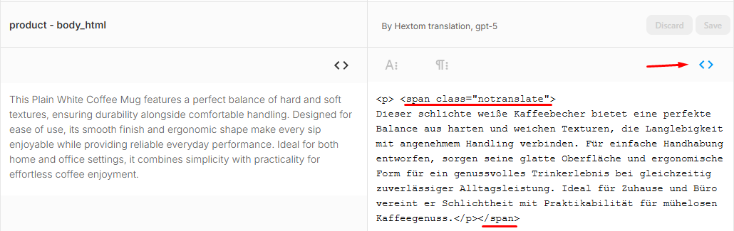 If the text supports HTML like product descriptions, we can wrap it with the following code through Manual Editor tool to prevent it from being translated by auto-coverage: