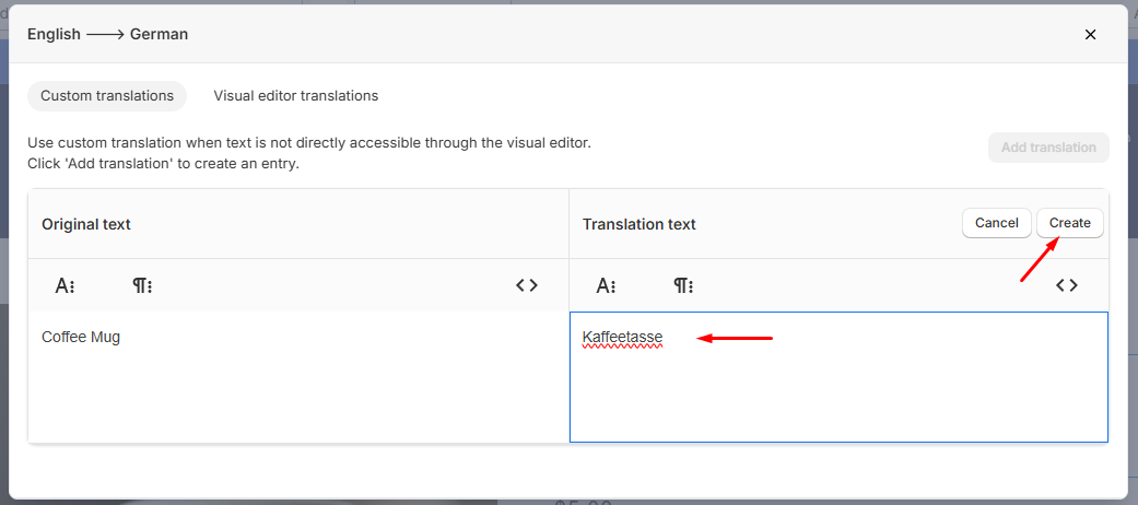 - Set the same base and translation text, then click "create" to add the translation and the visual editor will automatically add the wrapper.