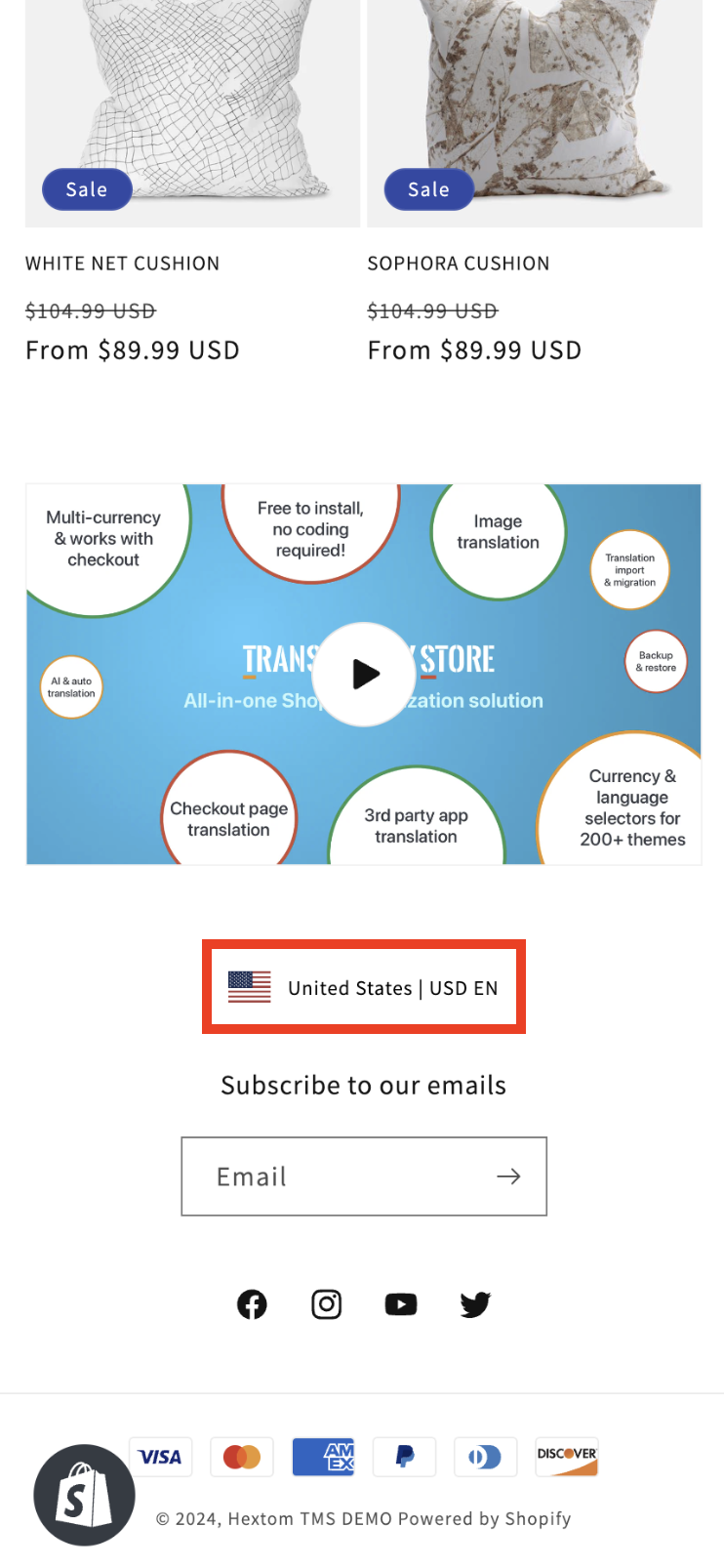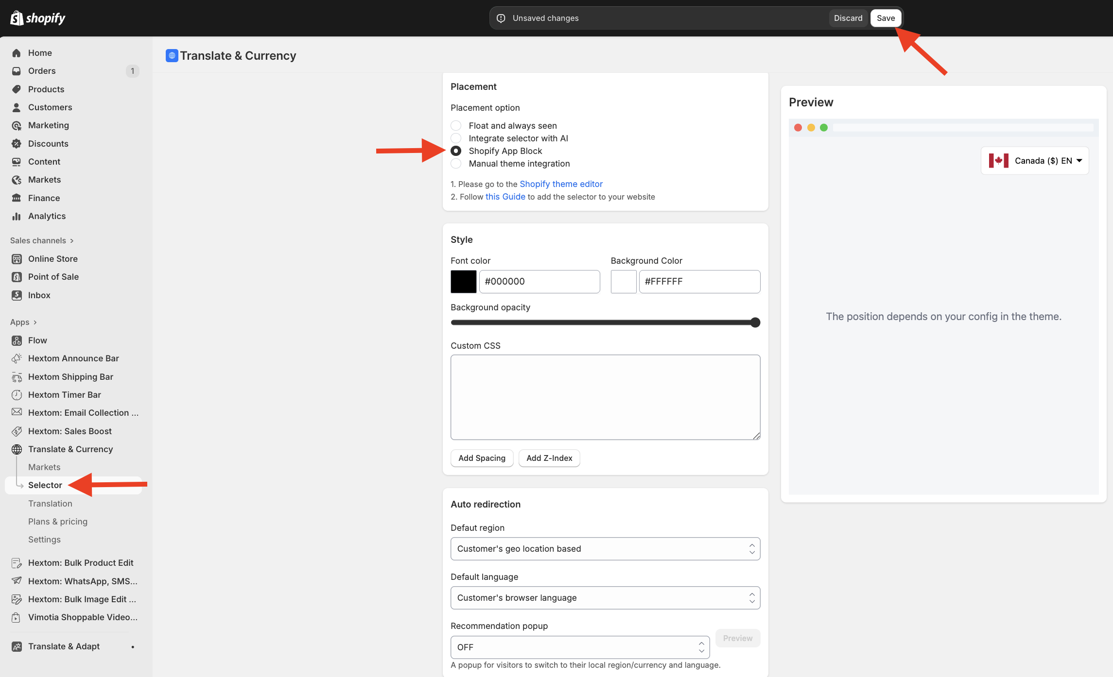Hextom: Translate & Currency app offers four options to add a currency/language selector to your website. To place the selector in a custom position, like in the header or footer, use the Shopify App Block option under Placement Option in the app.