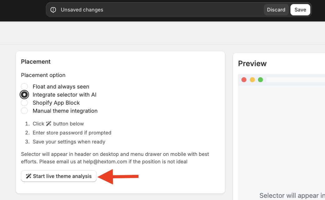 Our app also offers a way to integrate the selector into your theme using AI. With this option, the AI will analyze your live theme and place the selector automatically. On desktop, it will appear in the header, and on mobile, it will appear in the menu drawer, based on the best-fit placement.