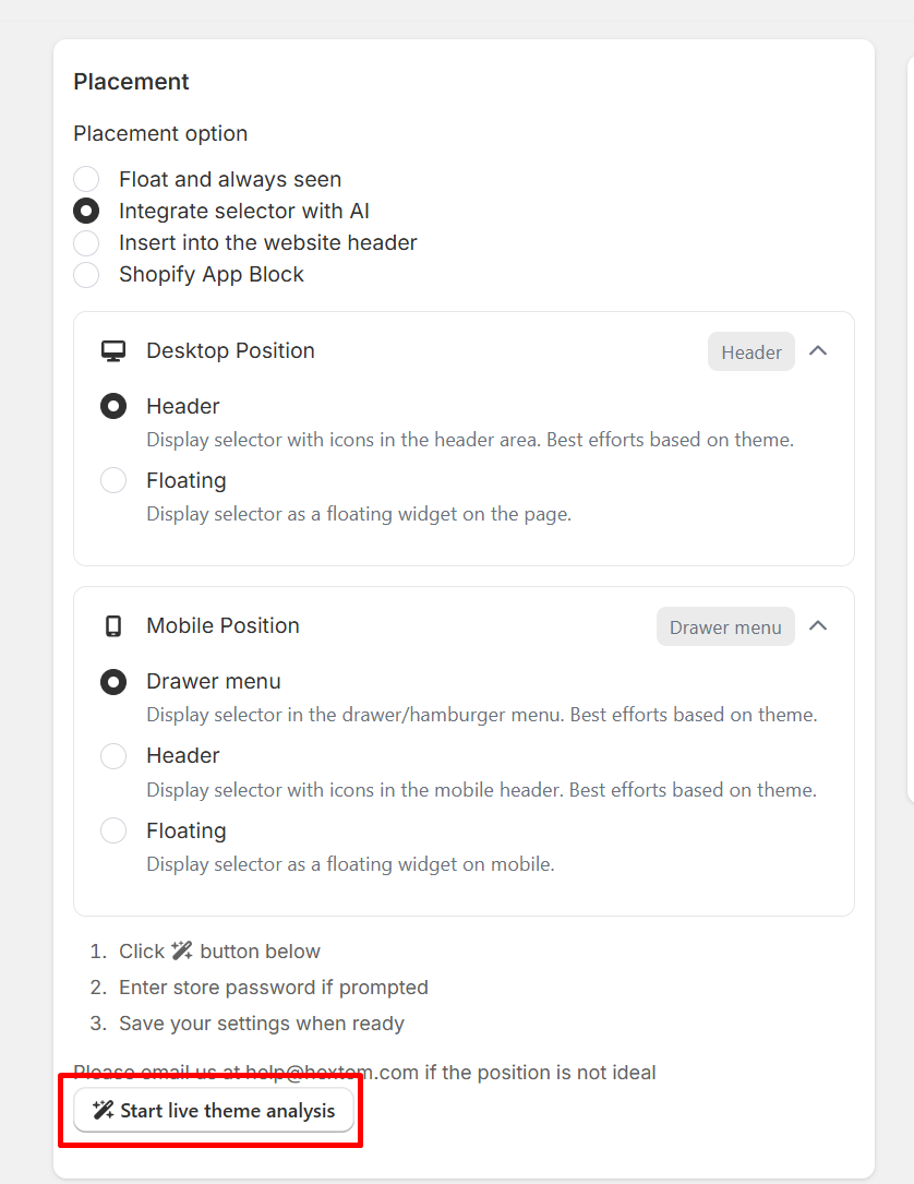 For example, if you wanted to have the selector in the header on desktop, but in the drawer menu on mobile, then you could choose the corresponding options in the dropdowns, and click the Start live theme analysis button to have our AI place the selector in those positions.