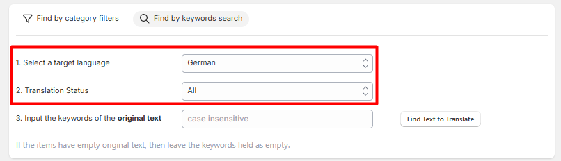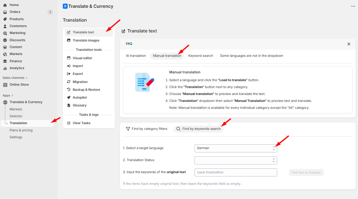 Go into the "Manual Translation" tool located in the sidebar and select "Find by keywords search".