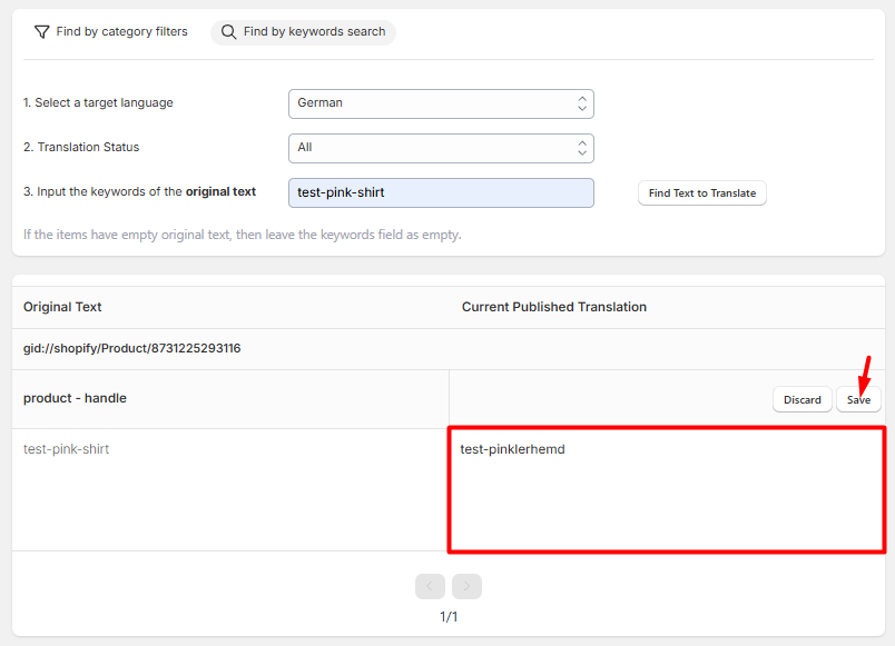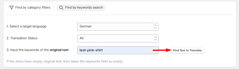 Input the original text of the text you want to translate. In this case, the original text of the URL handle is test-pink-shirt. Then click "Find Text to Translate".