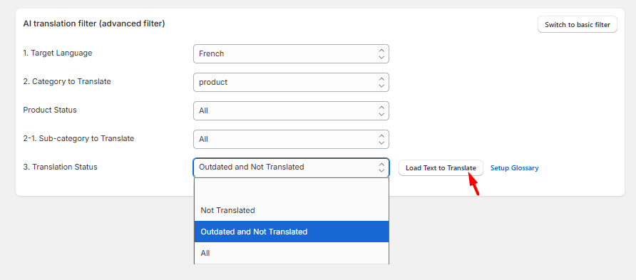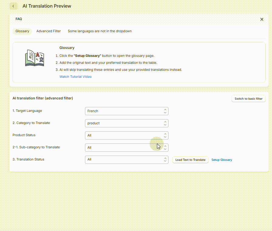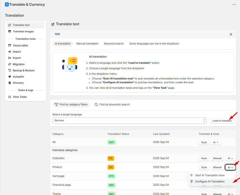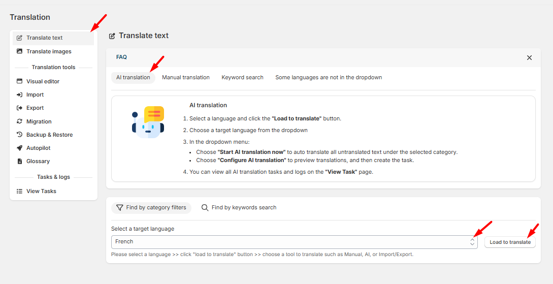 Under the Translation tab, navigate to Translate text > AI translation > Find by category filters, and choose a language. Click Load to translate.