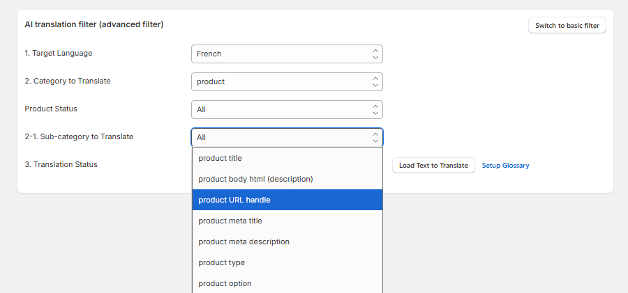 Choose the URL handle subcategory, and then choose the translation status of the text you want to translate. Click Load Text to Translate.