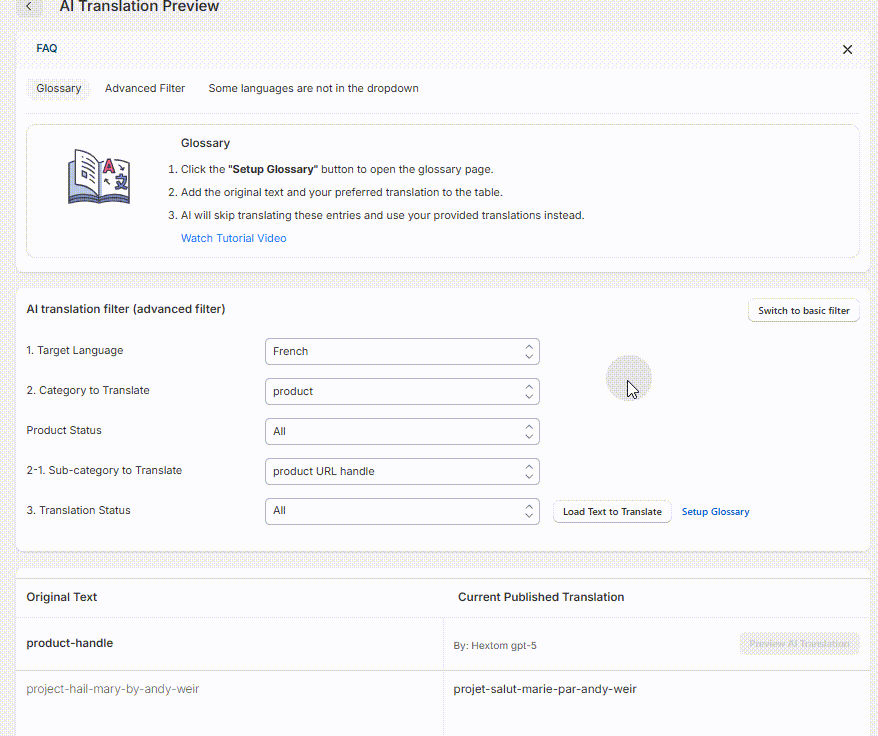 Choose the category of URL handles you wish to translate. Under the AI dropdown, click on Configure AI Translation.