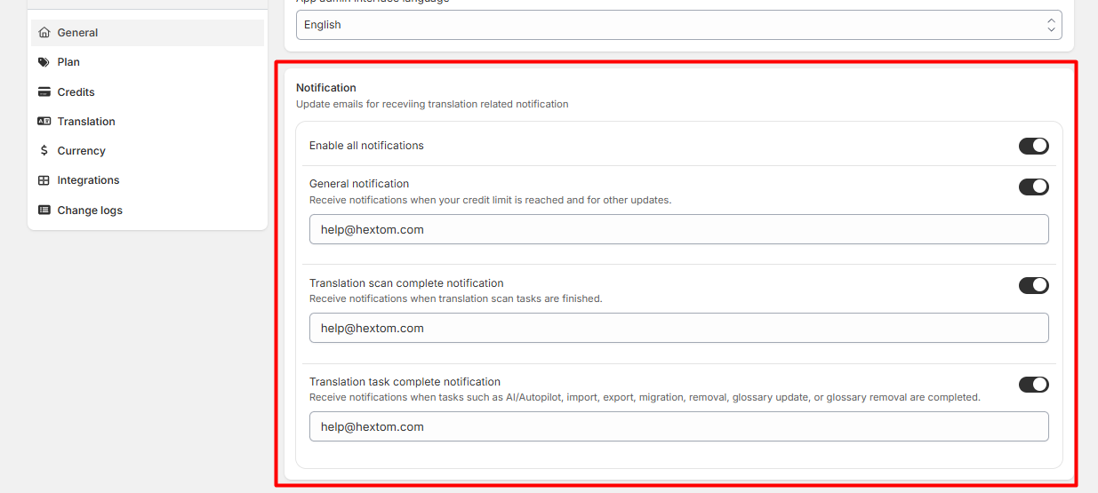 You can now customize how you receive email notifications from the Hextom: AI Translate & Currency app.