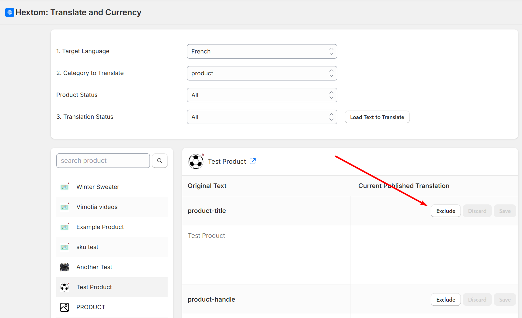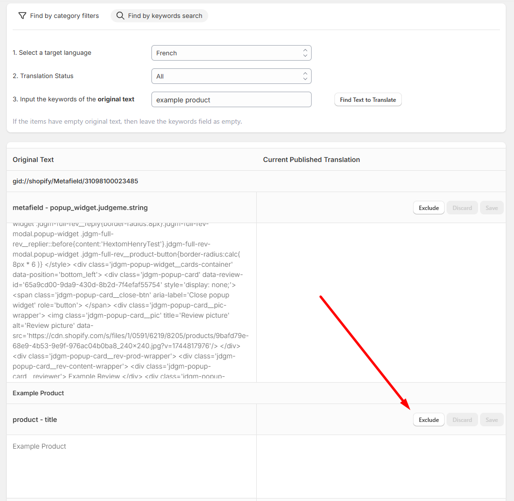If you only need to exclude a specific text, such as one product title, or one element of text on the home page, then you can quickly add an exclude rule by finding this text in our app's manual translation tool and pressing the new "Exclude" button.